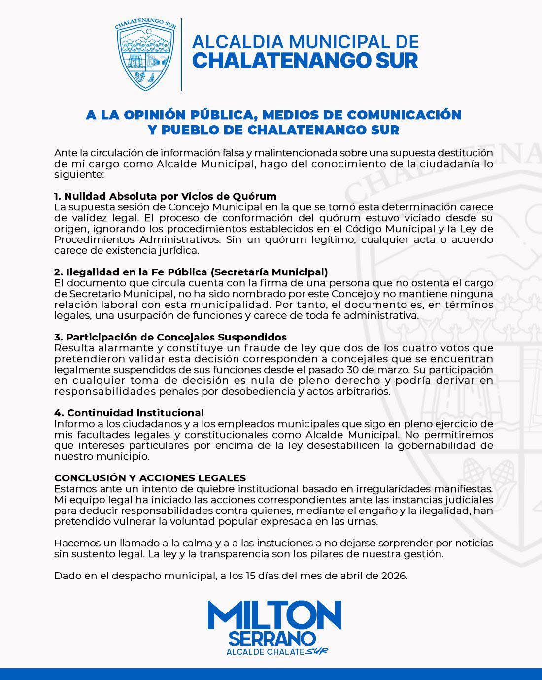 El alcalde de Chalatenango Sur, Milton Guadalupe Serrano Ramírez, rechazó públicamente su destitución, asegurando que el proceso carece de validez legal y presenta múltiples irregularidades.