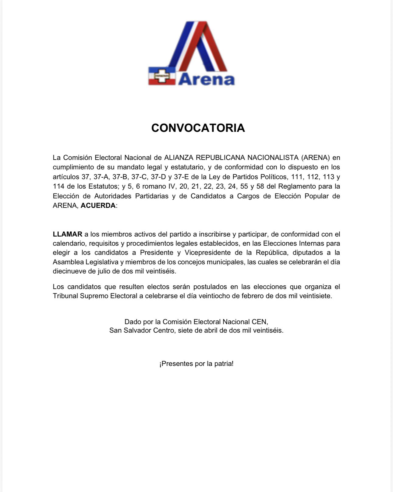 La Alianza Republicana Nacionalista (ARENA), a través de su Comisión Electoral Nacional, lanzó una convocatoria dirigida a sus miembros activos para participar en el proceso de elecciones internas del partido.