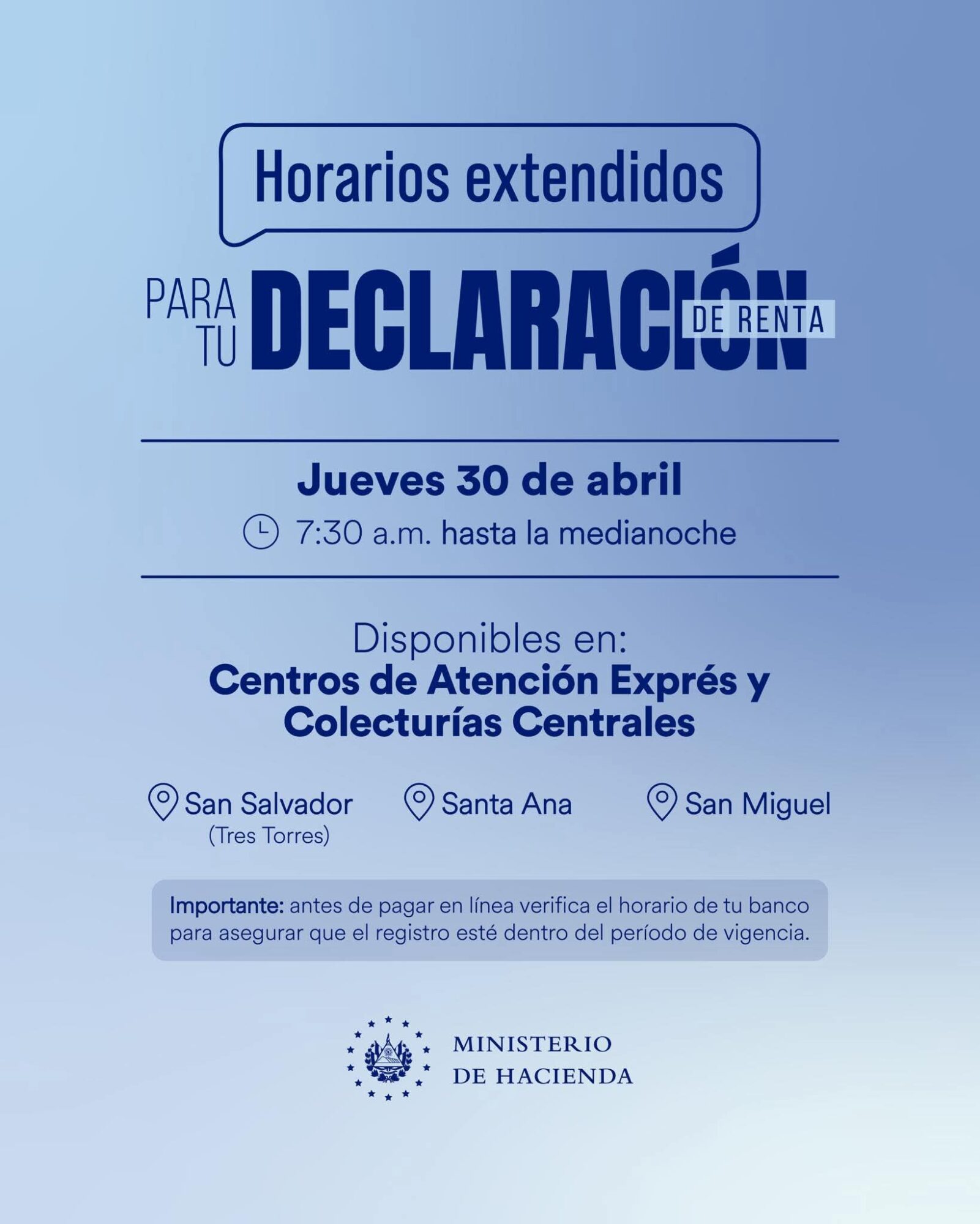 De acuerdo con el aviso oficial, los Centros de Atención Exprés y Colecturías Centrales ubicadas en San Salvador, Santa Ana y San Miguel atenderán desde las 7:30 de la mañana hasta la medianoche.