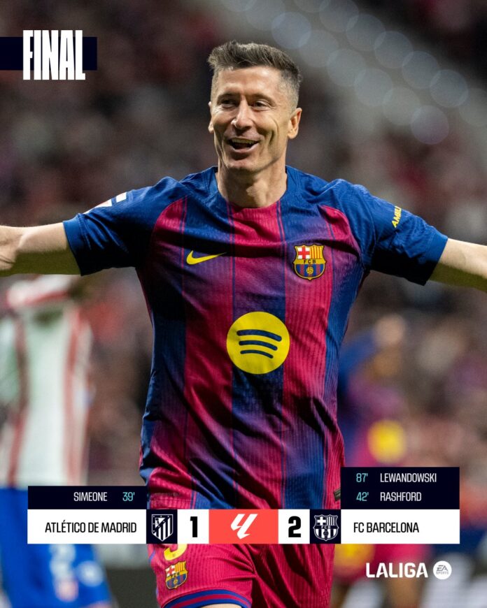 A un gol final de Robert Lewandowski, a un rebote en su hombro tras una parada de Juan Musso, ya por el minuto 88, los anteriores 43 con superioridad numérica, debió recurrir este sábado el Barcelona para superar al Atlético de Madrid y enfilar la Liga, aprovechada a última hora la derrota anterior del Real Madrid en Mallorca.