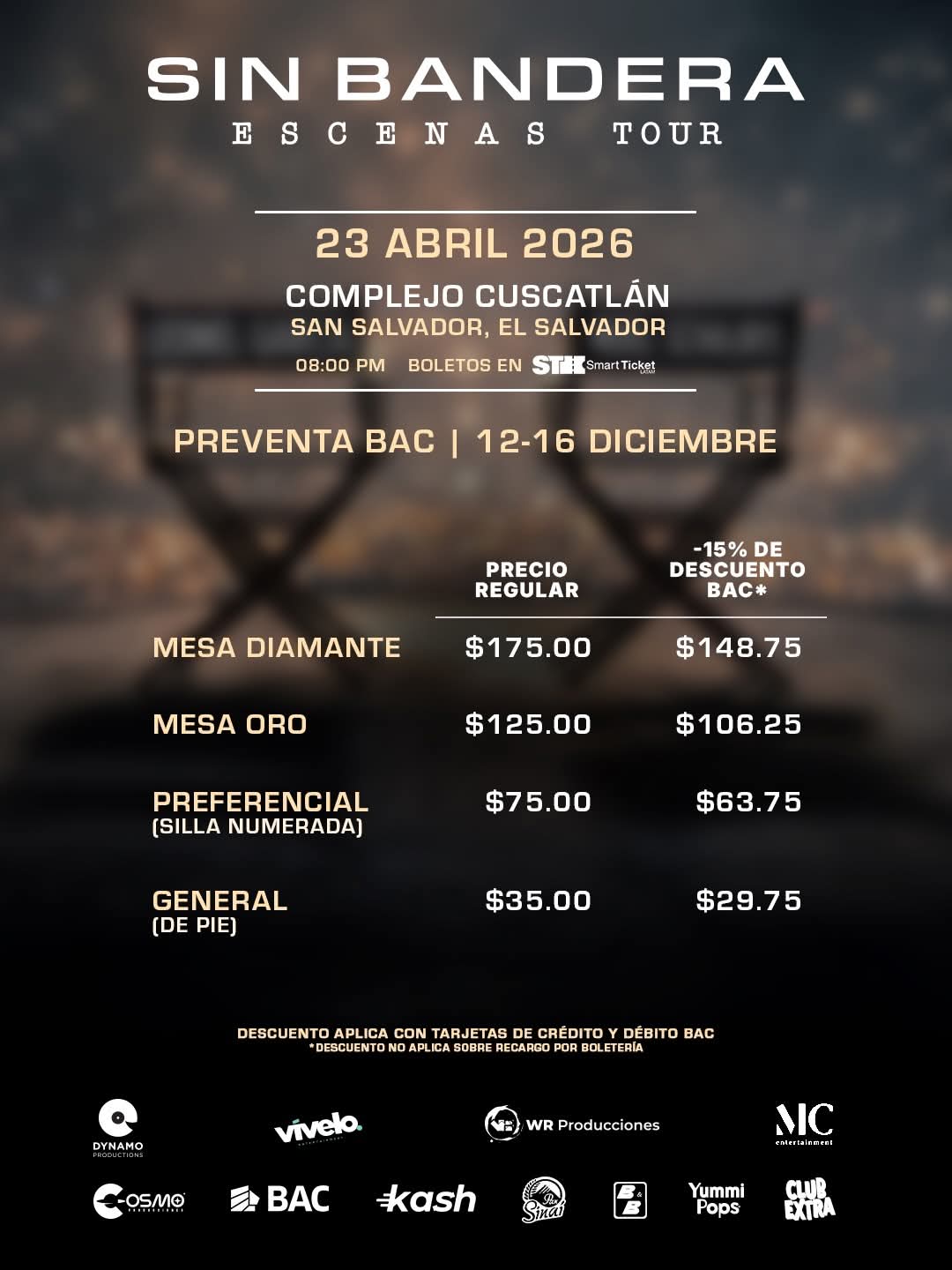 El concierto está programado para el martes 23 de abril de 2026 a las 8:00 de la noche en el Complejo Cuscatlán, donde los asistentes podrán disfrutar tanto de su nueva producción musical “Escenas” como de sus más grandes éxitos.