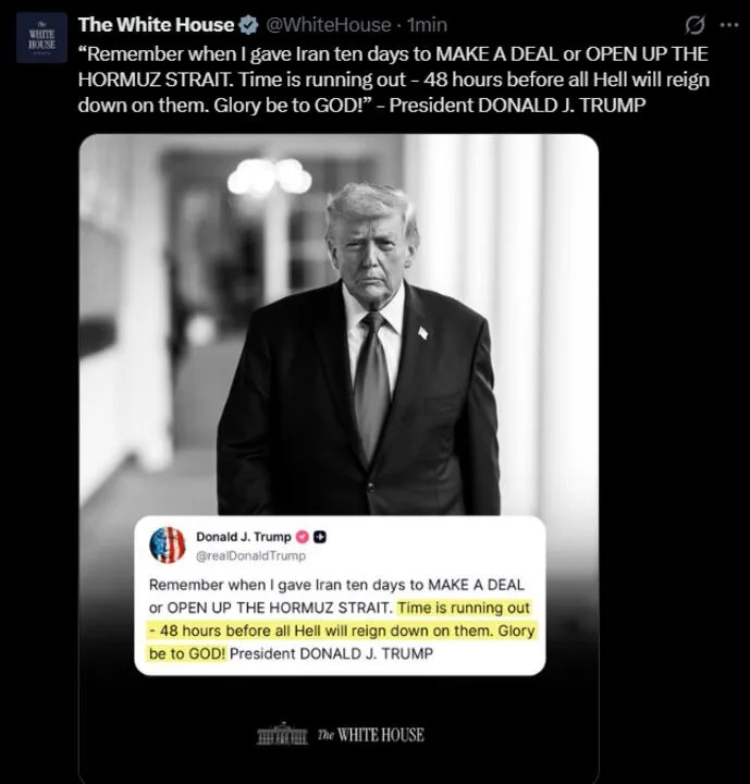 “¿Recuerdan cuando le di a Irán diez días para que llegara a un acuerdo o abriera el estrecho de Ormuz? El tiempo se acaba: 48 horas antes de que el infierno se apodere de ellos. ¡Gloria a Dios!“, escribió en su cuenta de la red social Truth.