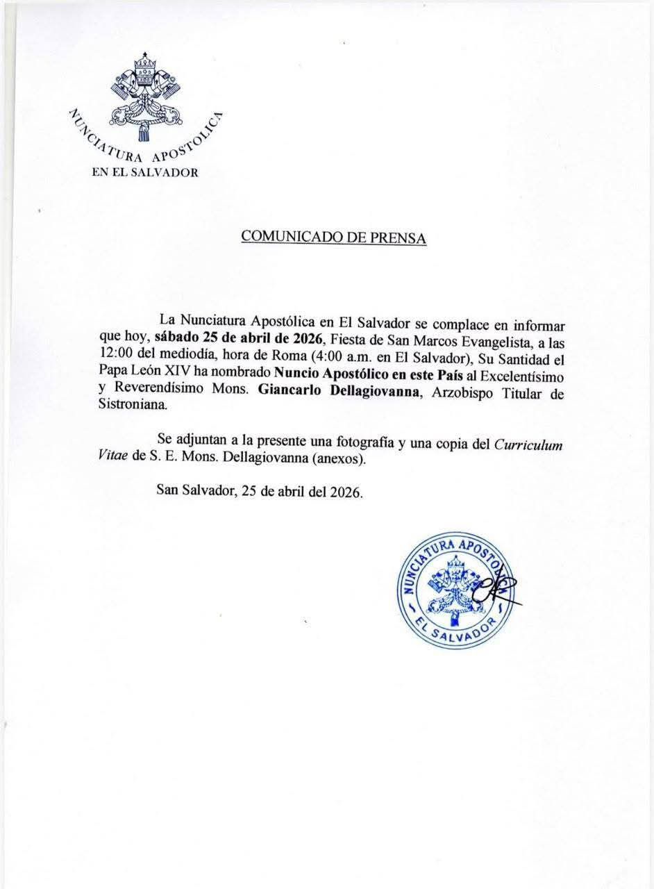 El Vaticano anunció este 25 de abril de 2026 el nombramiento de monseñor Giancarlo Dellagiovanna como nuevo nuncio apostólico en El Salvador.