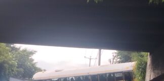 Bus parcialmente suspendido en el vacío sobre puente San José de...